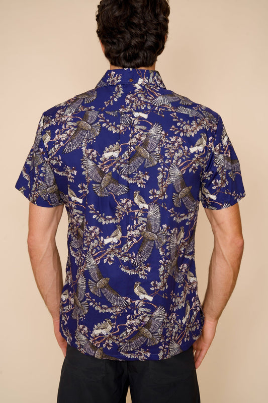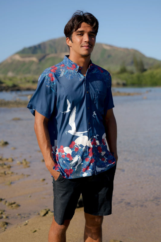 Manu-o-Kū & Hau Tree Blue Aloha Shirt (Iron Free)