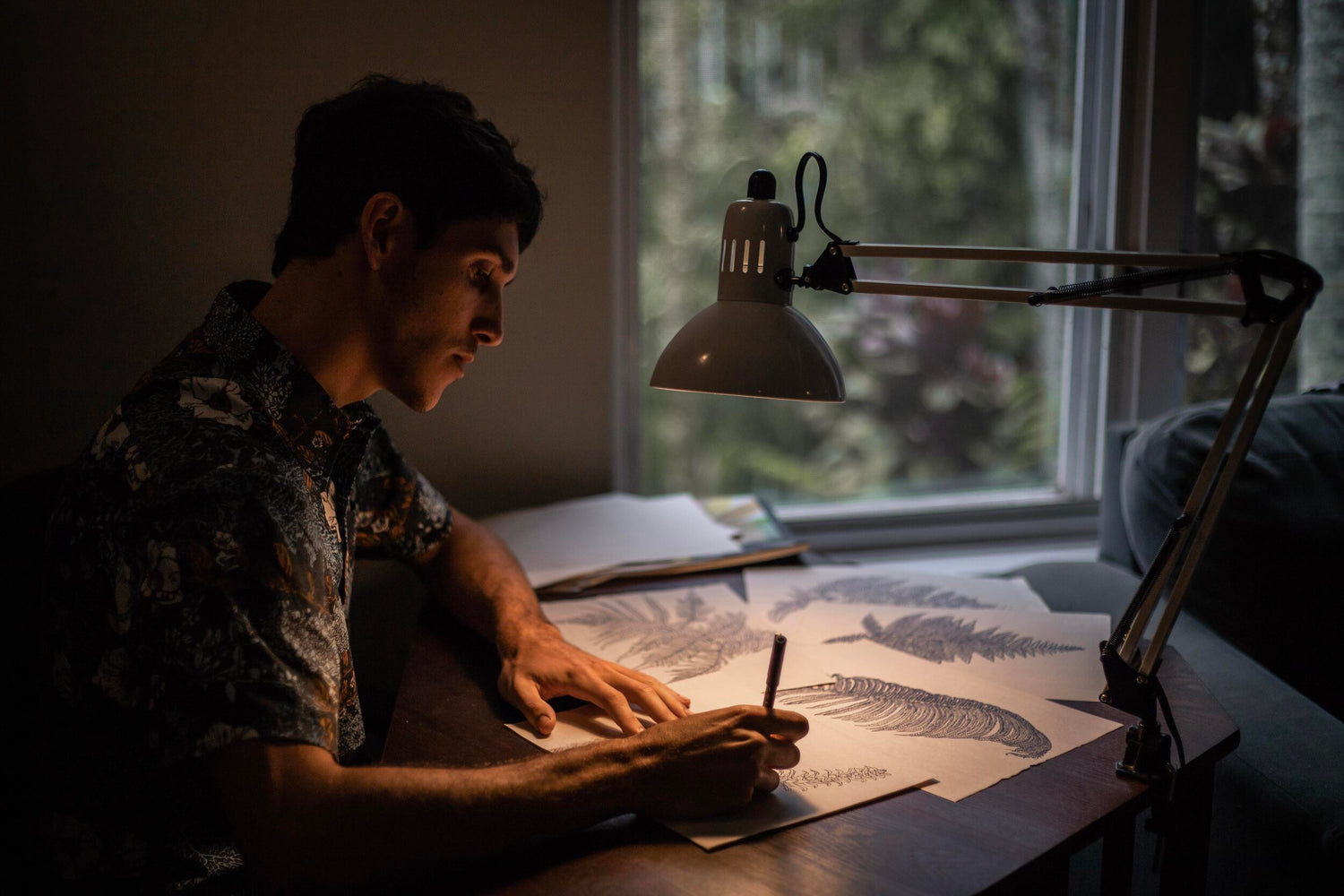 David Shepard hand draws detailed artistic representations of native Hawaiian plants at his rainforest home in Honolulu.