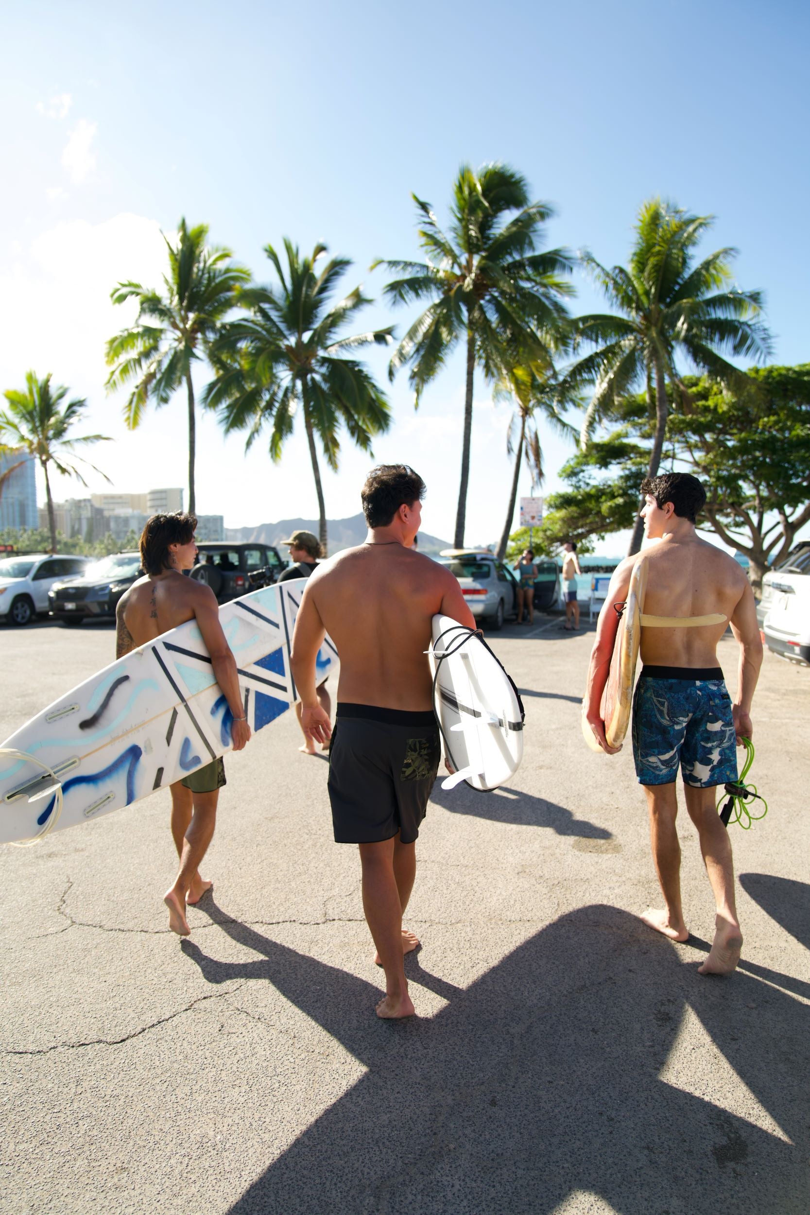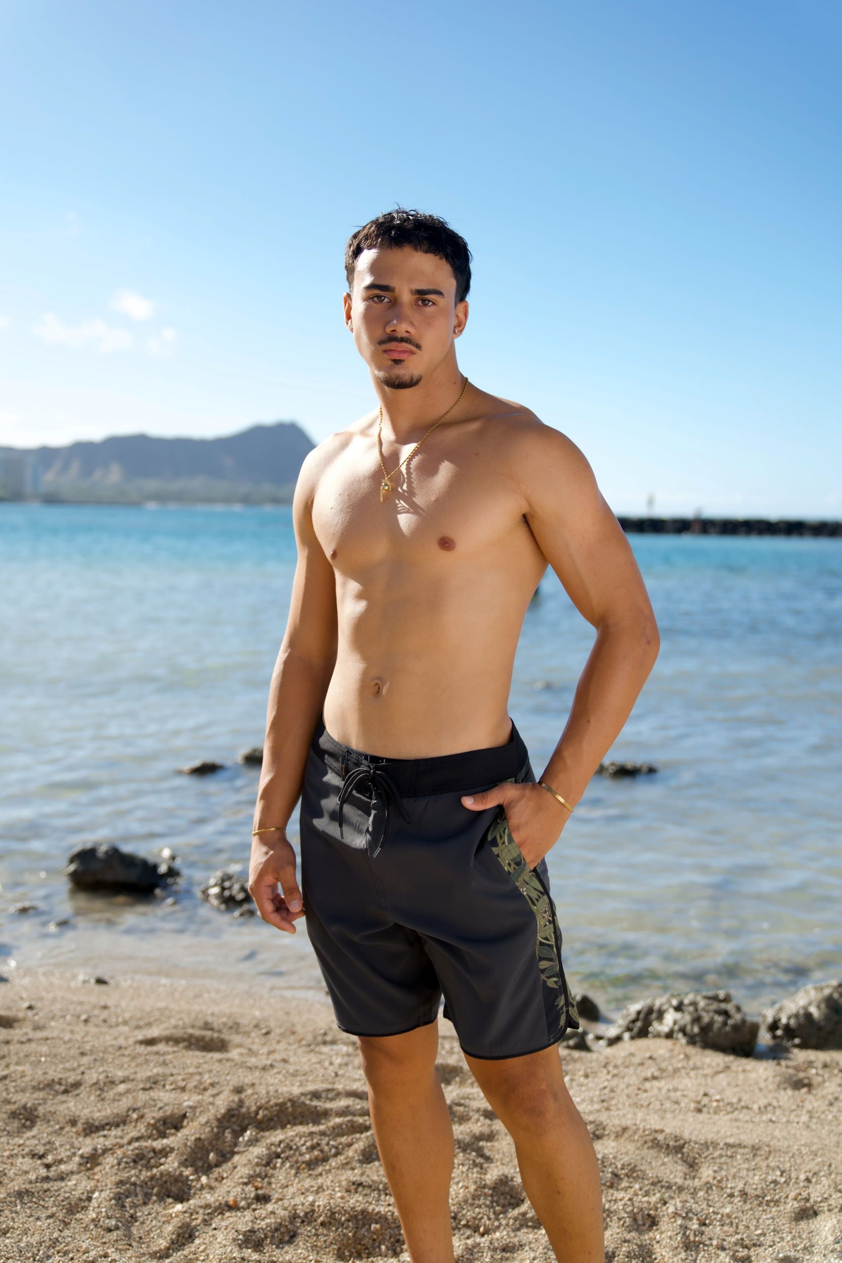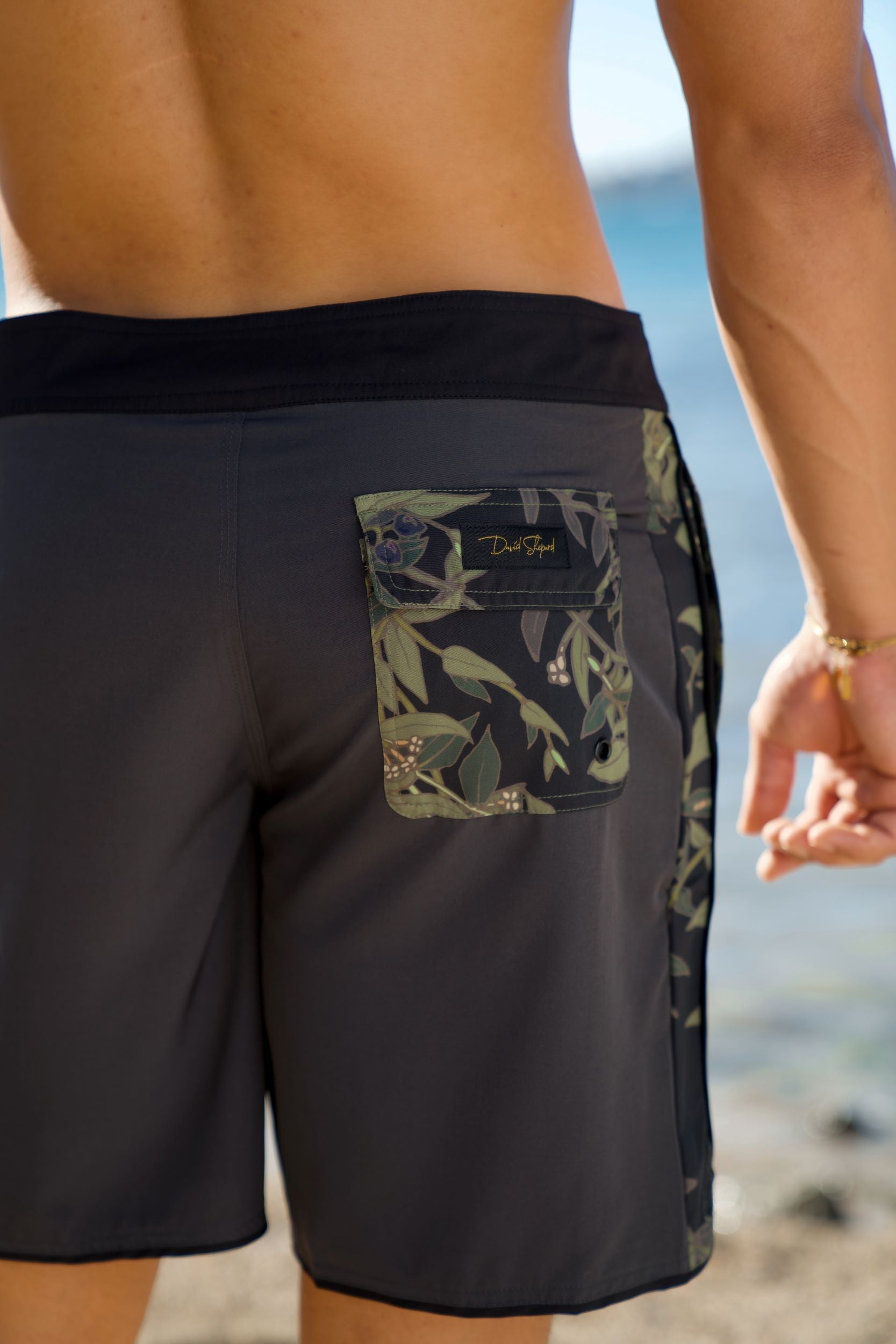 Quick drying 8 inch in-seam board shorts with a 19 inch out-seam. Designed in Hawai‘i for surf and ocean activities. Features sewn in drawstrings, two side pockets, and one back pocket. The velcro sealed back pocket includes a key loop. Fabric is stretchy being made of 96% polyester and 4% spandex. Low maintenance, easy care, and durable material and construction. Machine wash and hang dry or machine dry on a low setting.